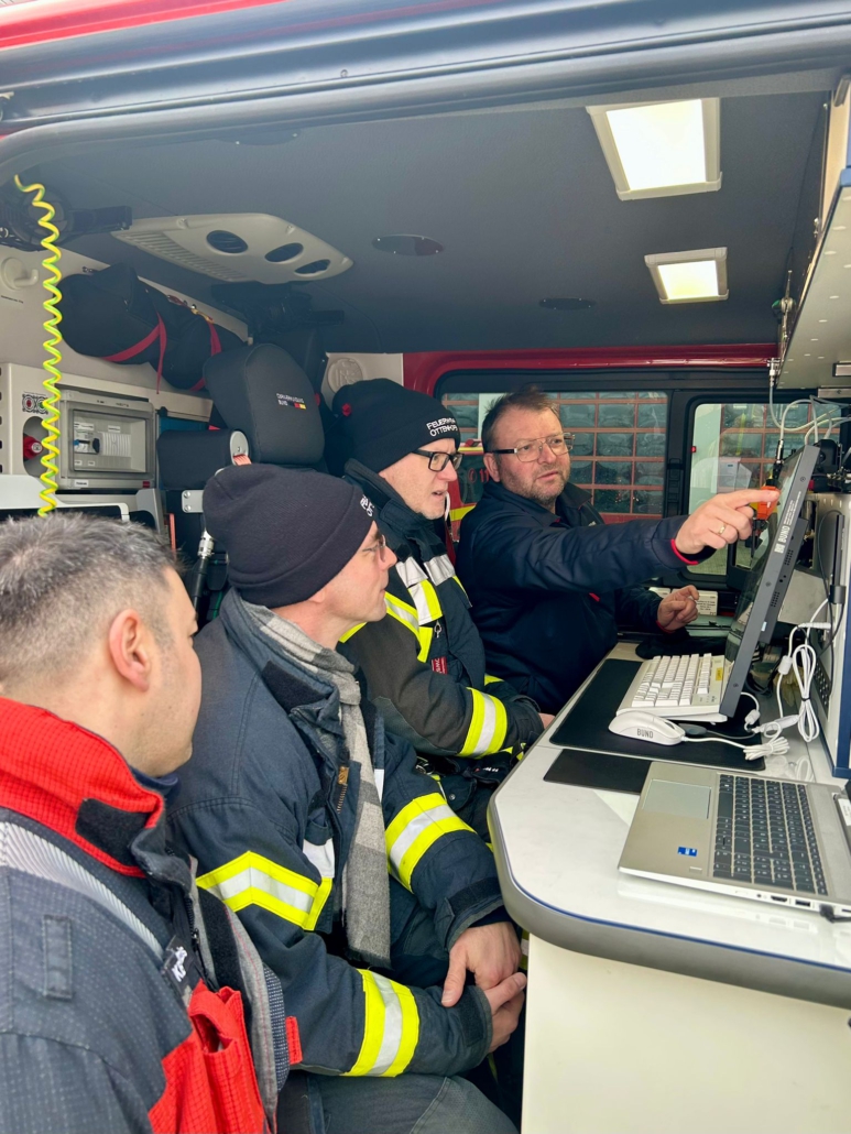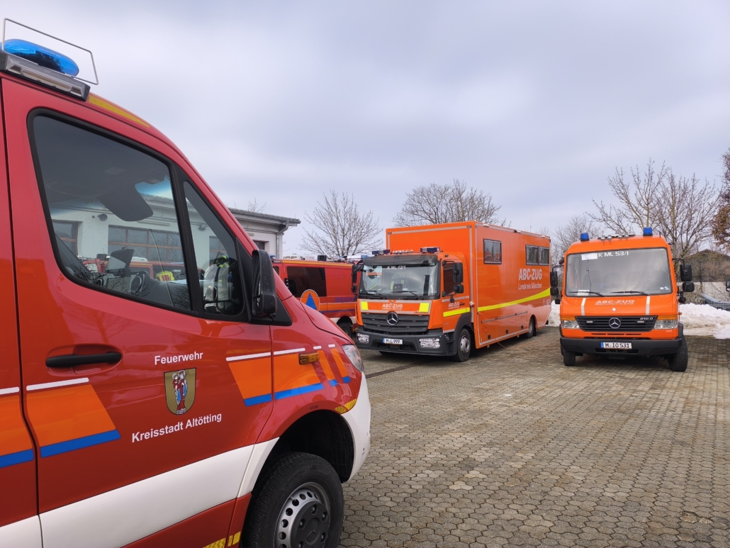 Anschließend wurde es ernst: Es wurden die Einheiten in eine Probenannahmestelle (im Feuerwehrhaus Neufahrn b. Freising), in eine Messleitstelle (ABC-Zug München Land) und in Erkundereinheiten aufgeteilt Die Feuerwehren aus Altötting, Schwindegg, Freising und der Stadt München waren dafür im Umkreis der vermeintlichen Unglücksstelle als Erkunder unterwegs. Unterstützt wurden sie dabei von den Kameraden aus Dietersheim und Ottenhofen, die sich bereits auf die Technik der spezialisierten Fahrzeuge vorbereiten, denn an diesen Standorten sollen möglicherweise ebenfalls CBRN-Erkunder stationiert werden. Ein besonderes Highlight war der Einsatz des neuen, vom Bund beschafften CBRN-Erkunder. Mit modernster Technik wurden mobile Gammastrahlungsmessgeräte aufgestellt und die Ortsdosisleistung gemessen. Besonders beeindruckend: Dank eines neuen digitalen Anbindungssystems wurden sämtliche Messwerte in Echtzeit an die Messleitstelle des ABC-Zugs München Land übermittelt.