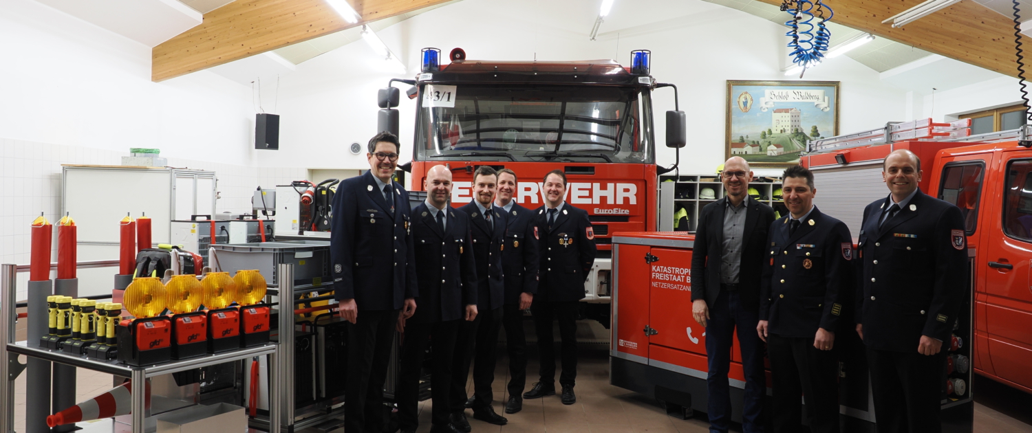 Kommandant Bastian Dorlyn, 2. Vorstand Martin Obereisenbuchner, 2. Kommandant Johannes Daxl, 1. Vorstand Thomas Gaßlbauer jun., 3. Kommandant Florian Brandl, Reischachs Bürgermeister Alfred Stockner, Kreisbrandrat Vincenzo Bucci und Kreisbrandmeister Simon Kollmannsberger.